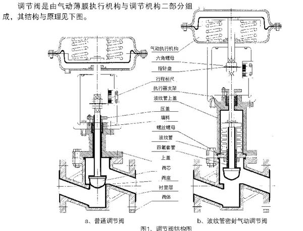 執行機構是氣動調節閥生產過程自動控制系統的重要組成部分,其有正反兩種作用形式,當信號壓力增加,推桿伸出膜室的叫正作用,與閥配合構成氣關式【如圖2a】。當信號壓力增加,推桿退出膜室的叫反作用,與閥配合構成氣開式【如2b】。其原理:當信號壓力輸人膜室后,在膜片上產生推力,壓縮彈簧,使推桿移動,帶動閥桿,改變閥芯與閥座之間的流通面積,直到彈簧的反作用與信號壓力作用在膜片上的推力相平衡,從而達到自動調節工藝參數之目的。