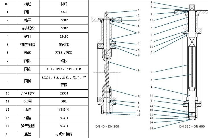 蝶板:電鍍球墨鑄鐵、鋁青銅、鈦鋼、CF8M不銹鋼、碳鋼、CF8不銹鋼